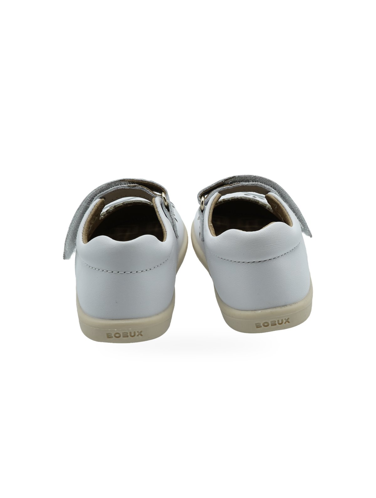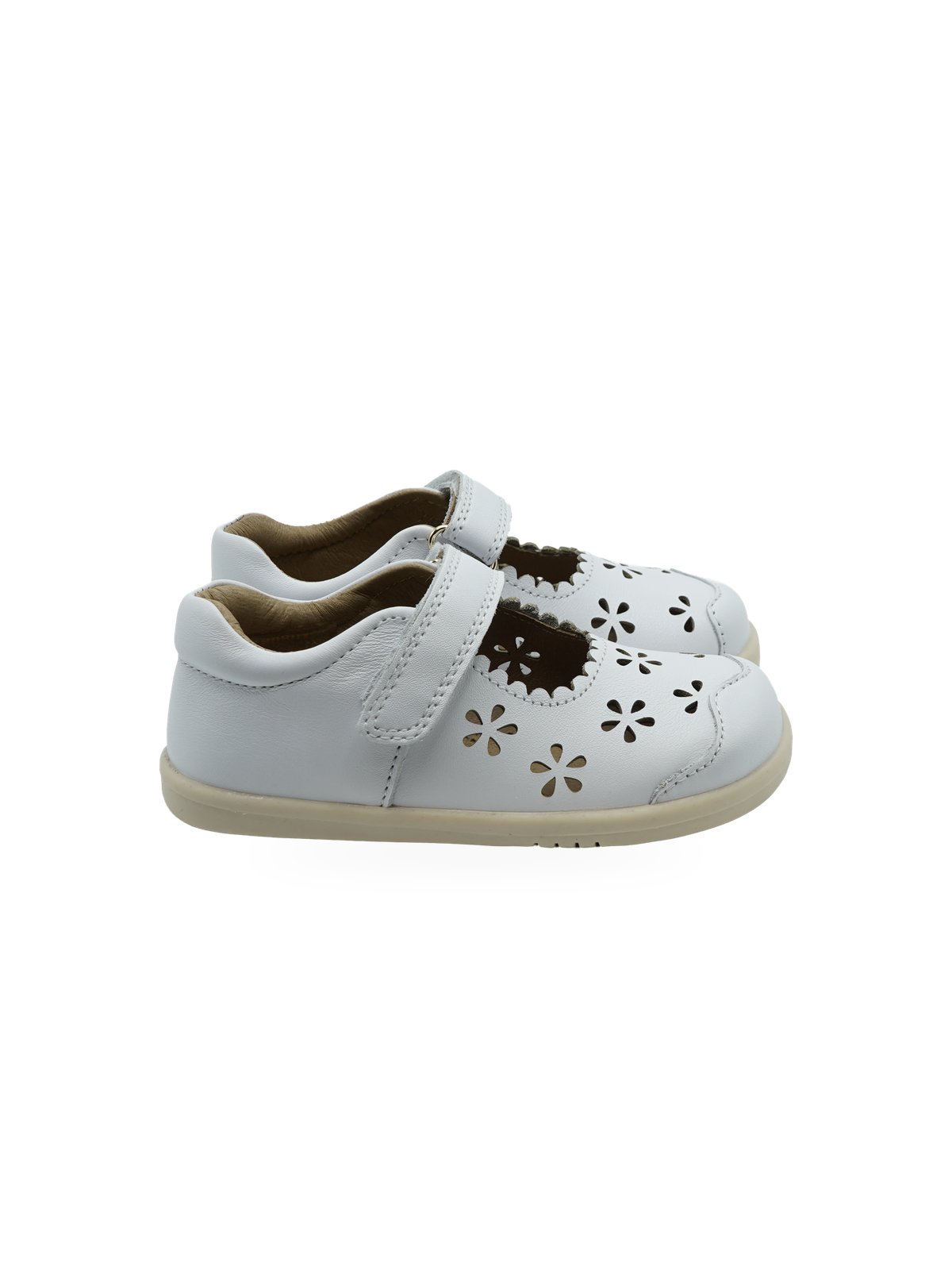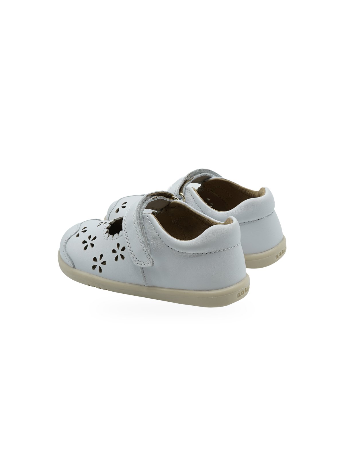 Scarpine Bobux bianche per prima infanzia con eleganti perforazioni floreali e chiusura a strappo. Design comfort per i primi passi.
