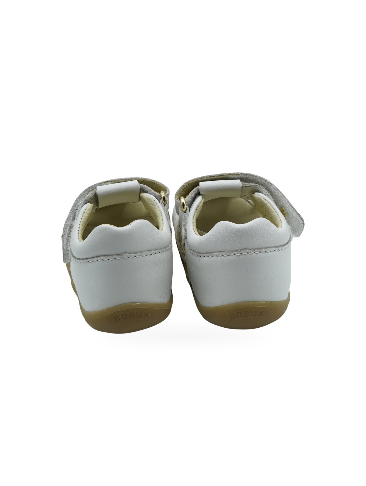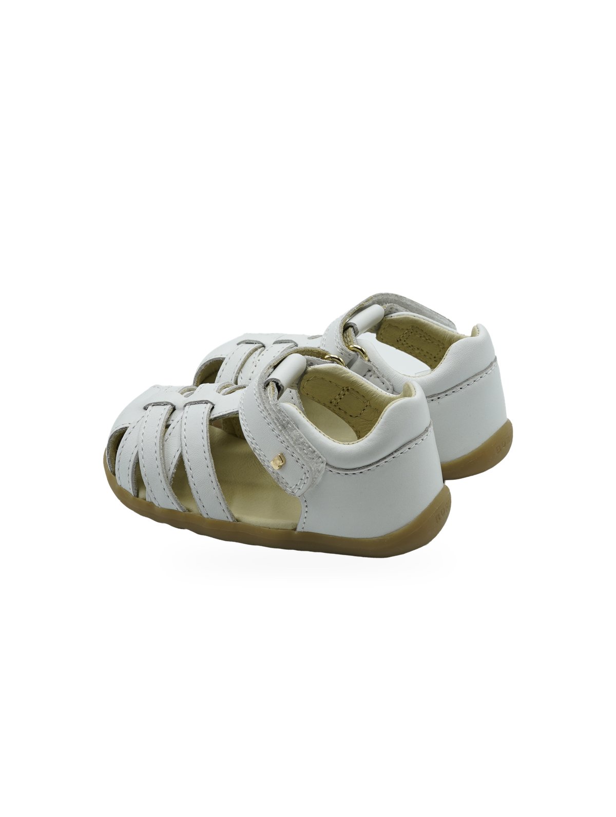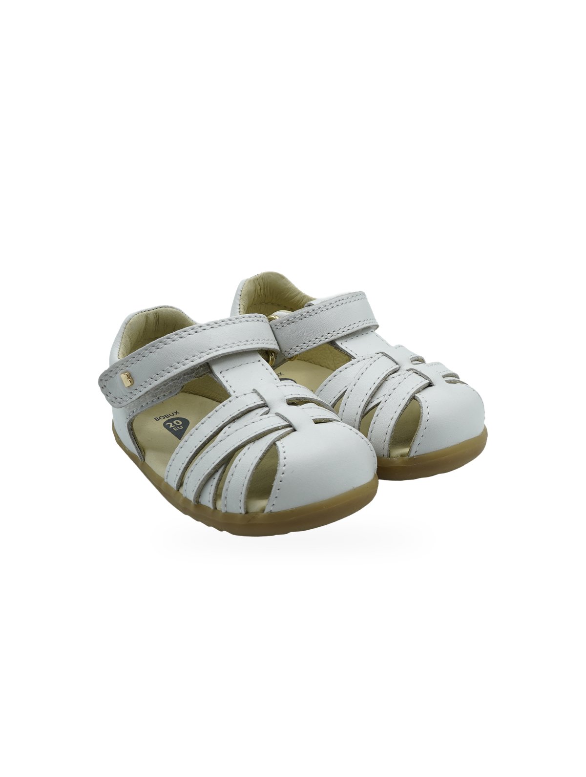 Sandali chiusi bianchi Bobux con chiusura a strappo e design traforato. Perfetti per i primi passi estivi.