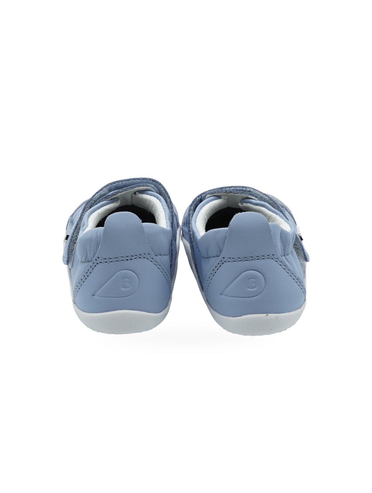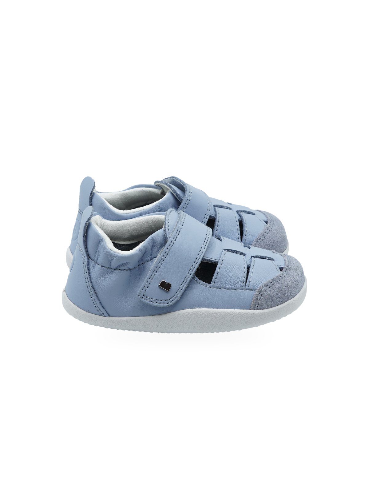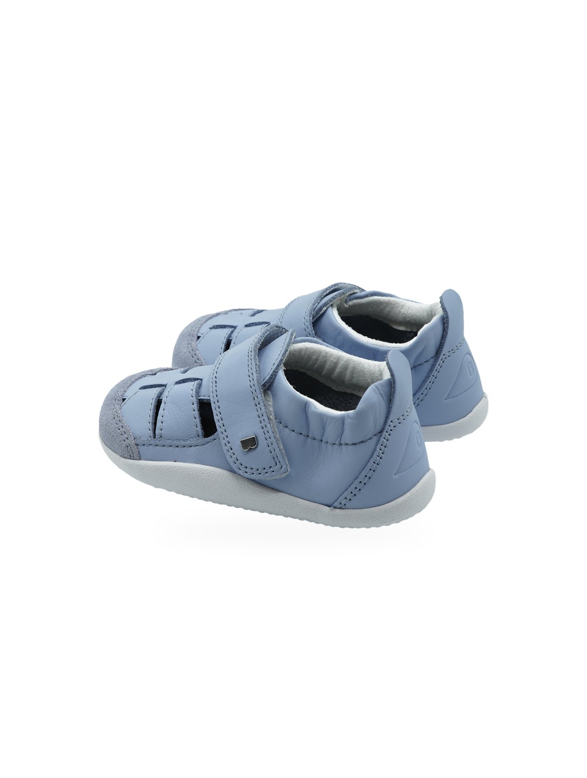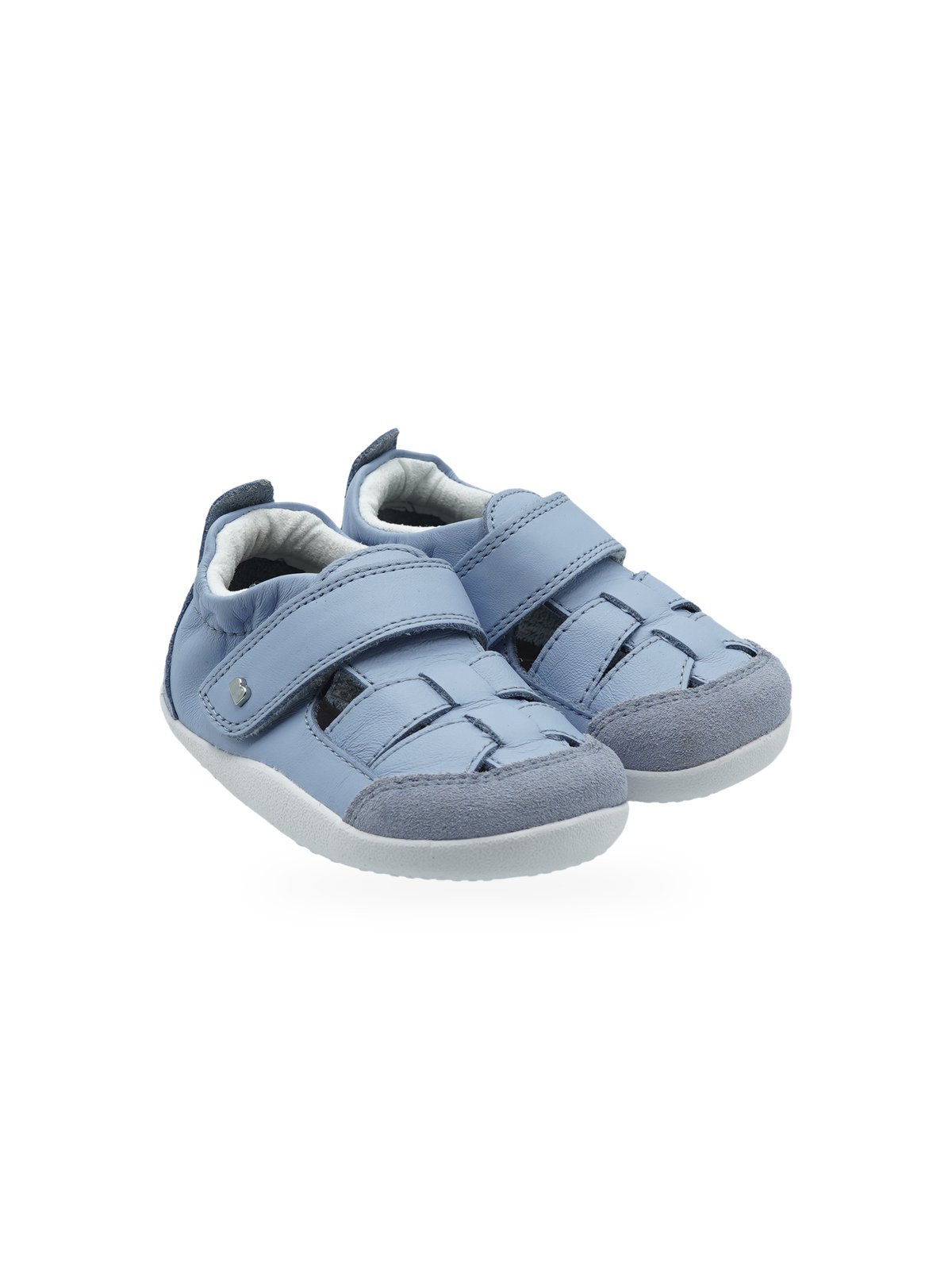 Scarpe primi passi Bobux in morbida pelle azzurra con design a sandalo chiuso e pratica chiusura a strappo.