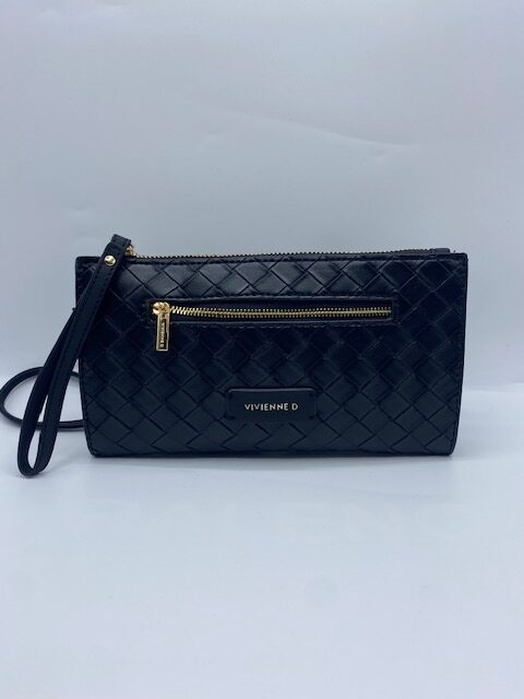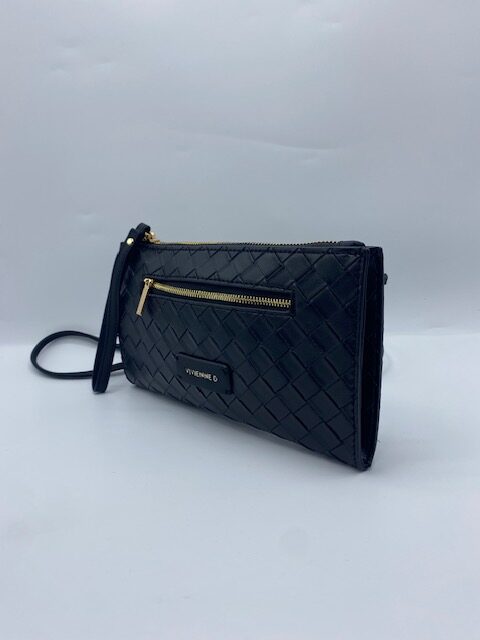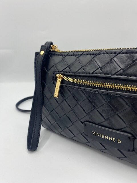 Busta tracolla twist Vivienne D colore nero in ecopelle con logo in finitura dorata e tasca frontale con cerniera