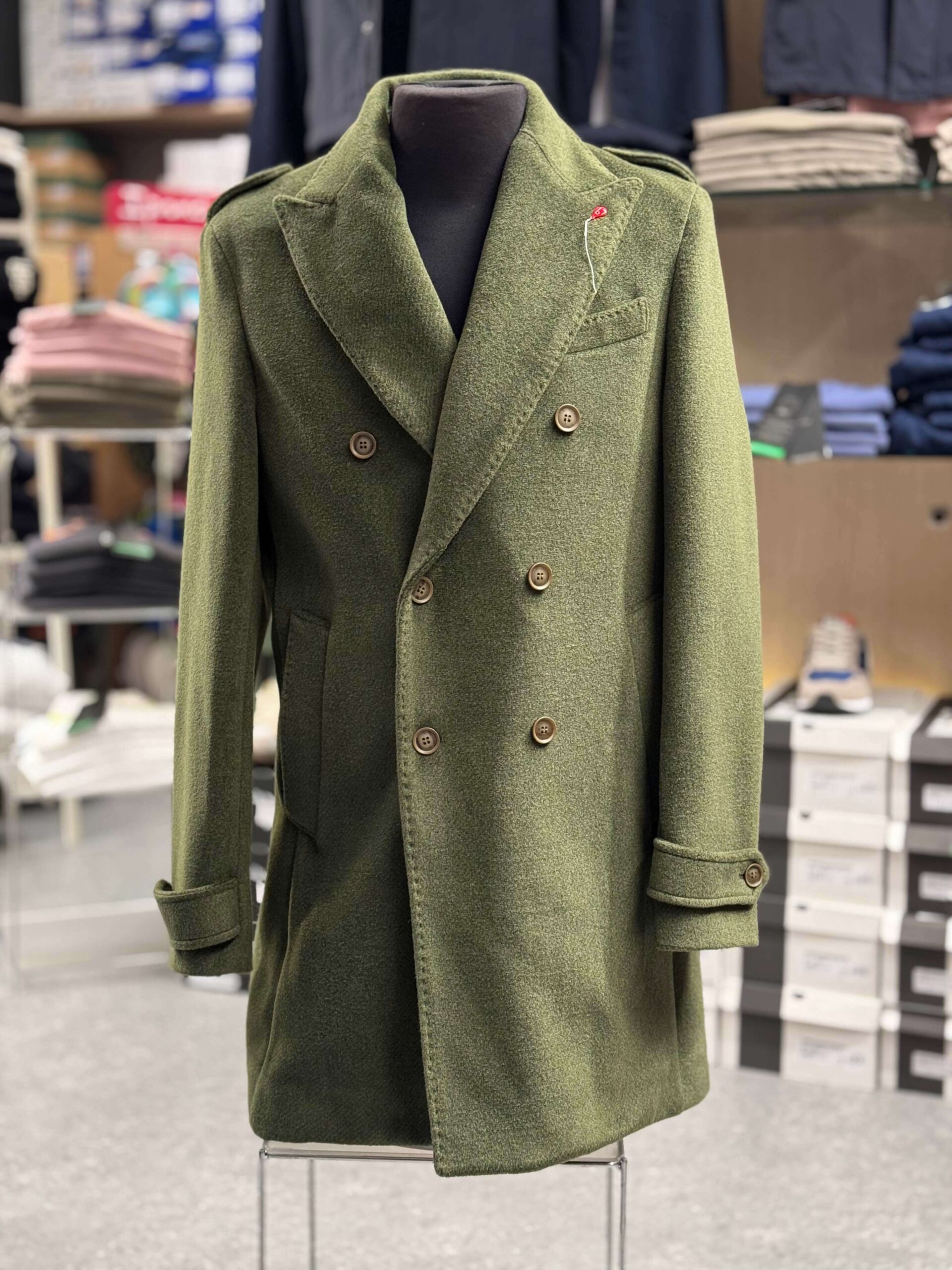 Eleganza militare, artigianalità italiana. Il cappotto doppio petto uomo Bernese Milano in colorazione verde oliva militare è il capo invernale che ridefinisce il guardaroba maschile di qualità. Costruito su proporzioni sartoriali bilanciate, rappresenta la sintesi perfetta tra il classico cappotto militare e l’estetica raffinata del menswear contemporaneo.