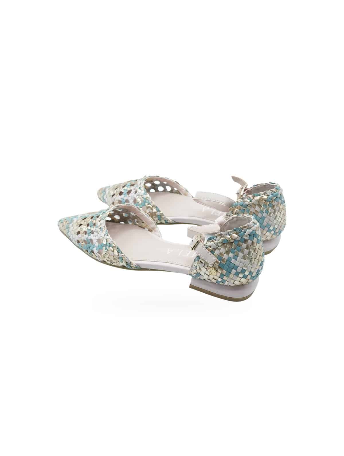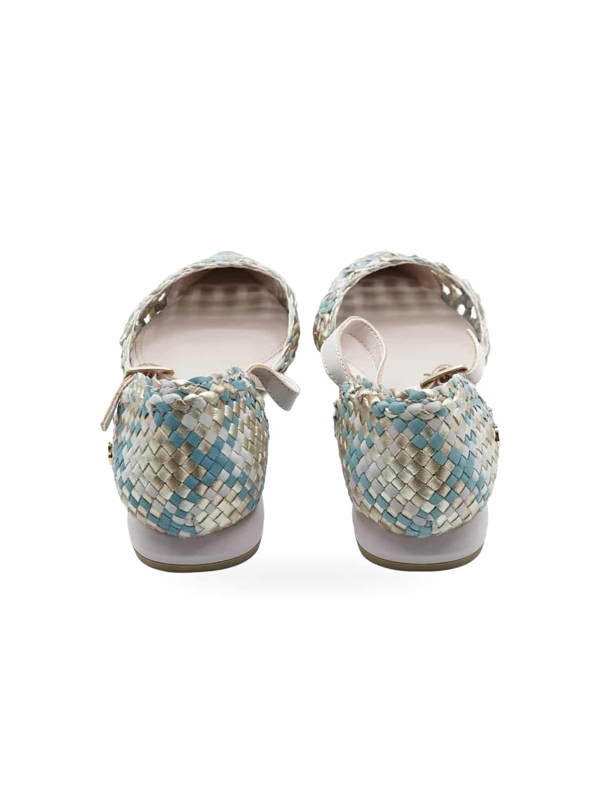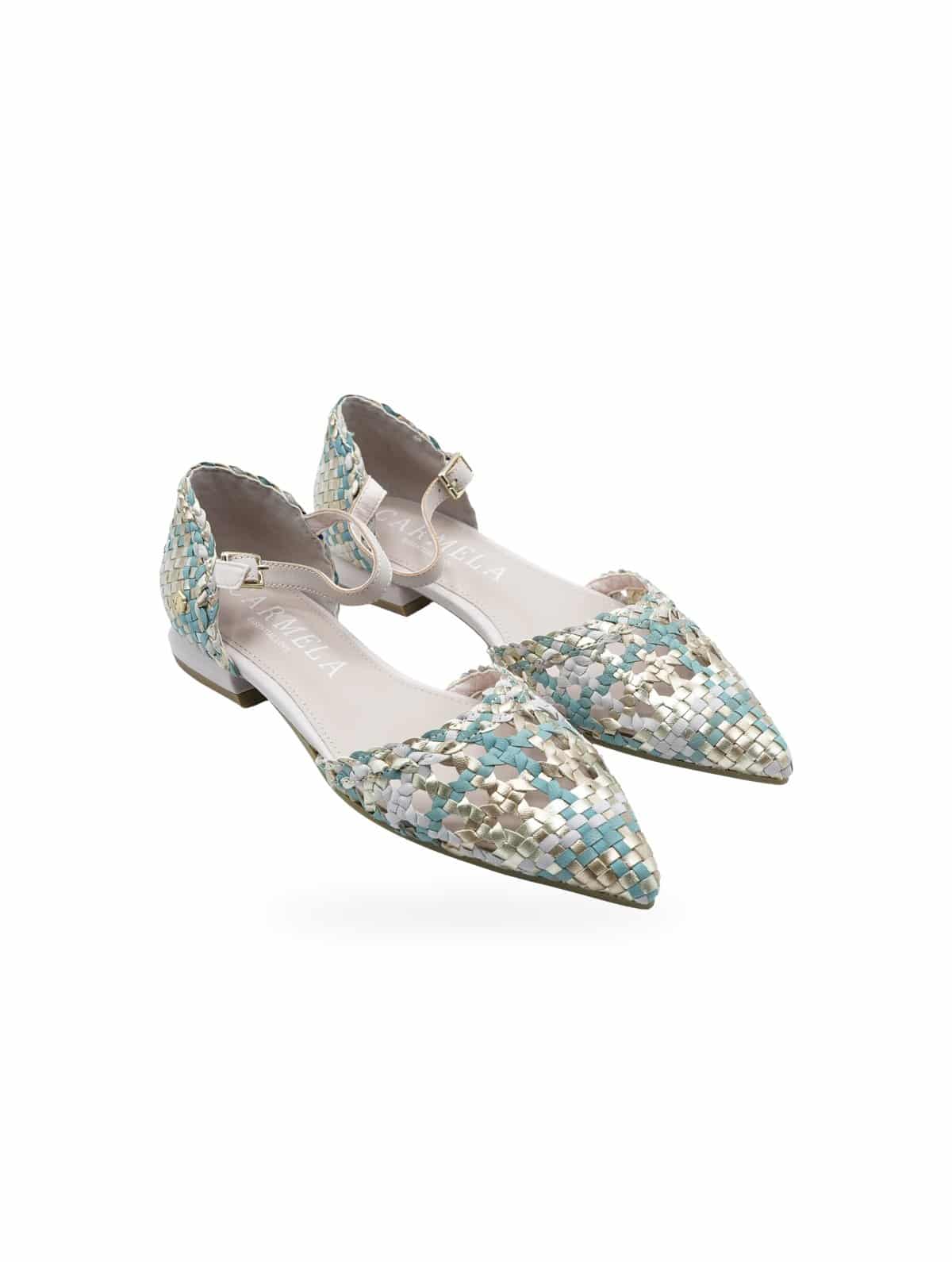 Le ballerine Carmela Shoes ZPIEL NUDE rappresentano l’eleganza moderna con un tocco di originalità. La tomaia presenta uno splendido intreccio geometrico che combina armoniosamente tonalità rosa cipria, oro metallico e turchese, creando un effetto cromatico sofisticato e versatile.