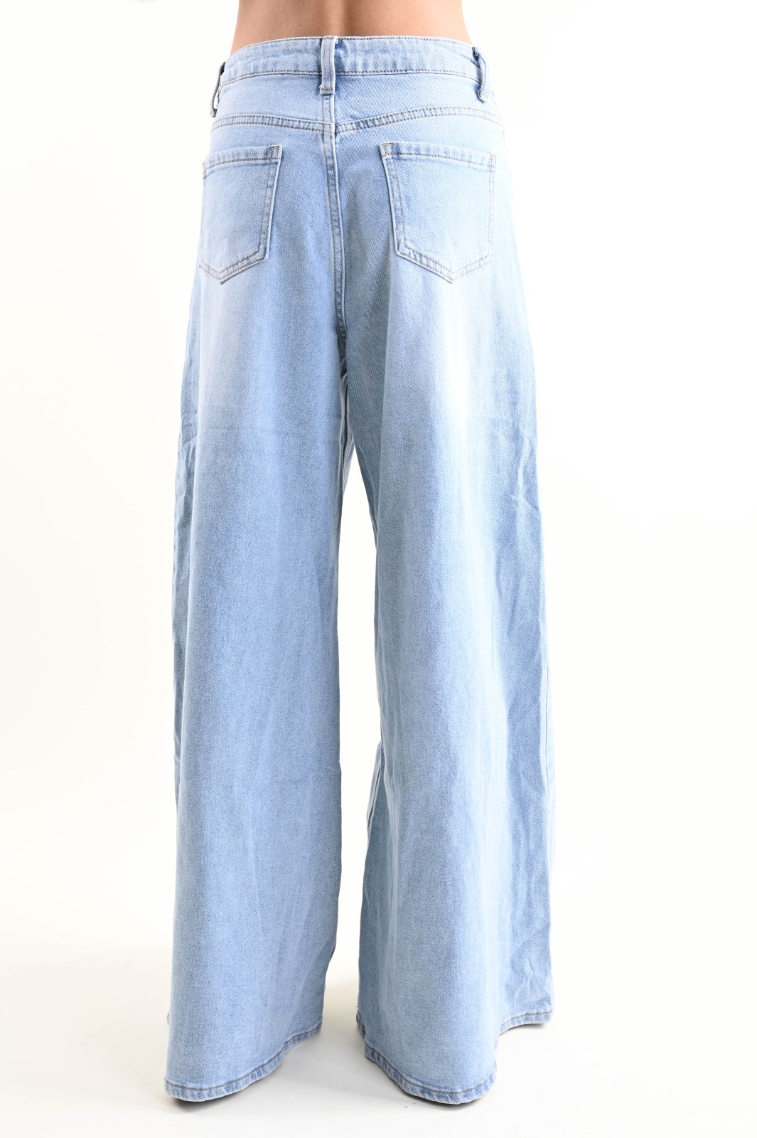 Jeans donna wide-leg a vita alta con lavaggio chiaro e uniforme. Modello 5 tasche, chiusura bottone e zip, 70% cotone. Look contemporaneo e versatile. Disponibile da Damiani Moda e Calzature.