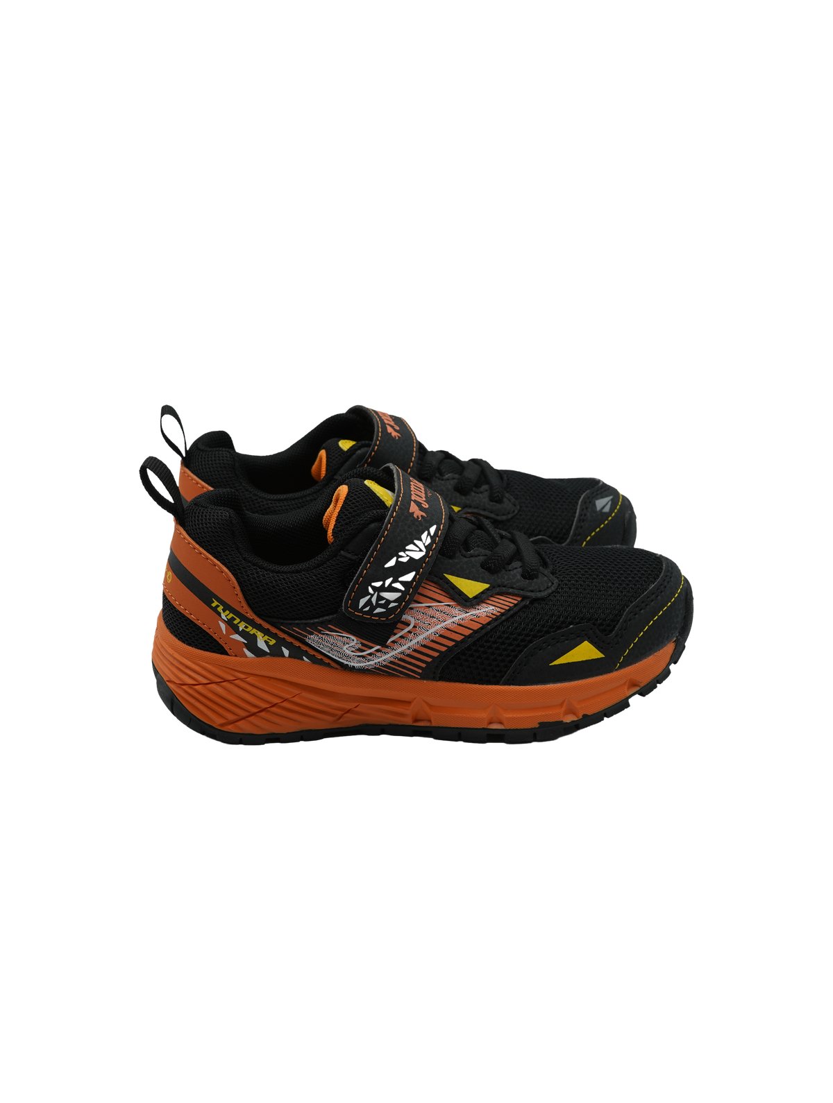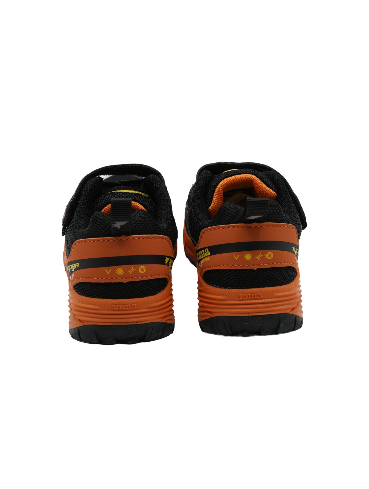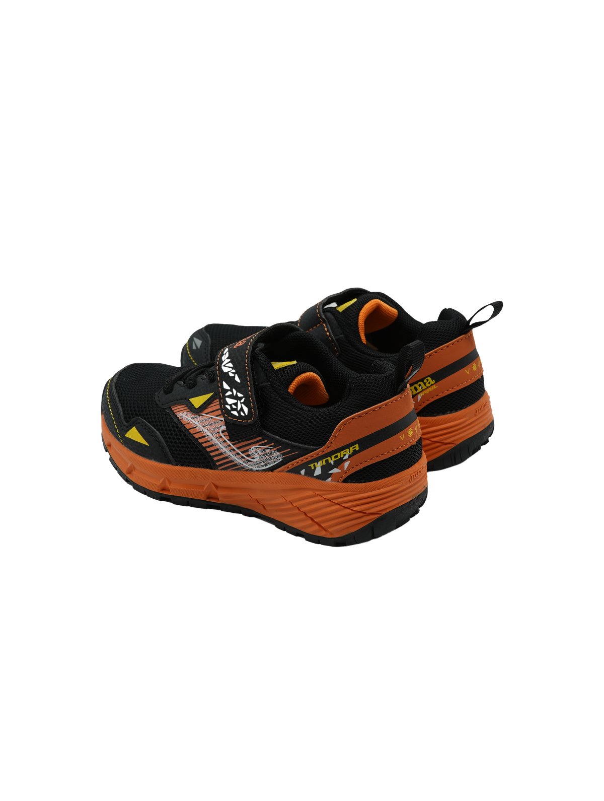 Sneakers sportive Joma Tundra per bambini con design dinamico nero e arancione, chiusura a strappo e dettagli colorati per il massimo comfort.