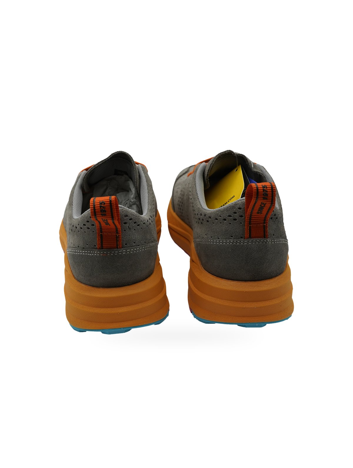 La suola bicolore presenta un design innovativo con intersuola arancione ammortizzante e battistrada blu per un grip eccezionale su ogni superficie. Il design del tallone con linguetta posteriore facilita la calzata, mentre la forma ergonomica si adatta perfettamente al piede maschile.
