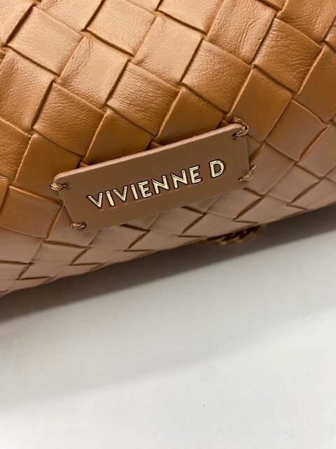 Maxi pochette twist Vivienne D color cuoio in ecopelle con due tasche interne di cui una con zip e logo Vivienne D con finiture oro