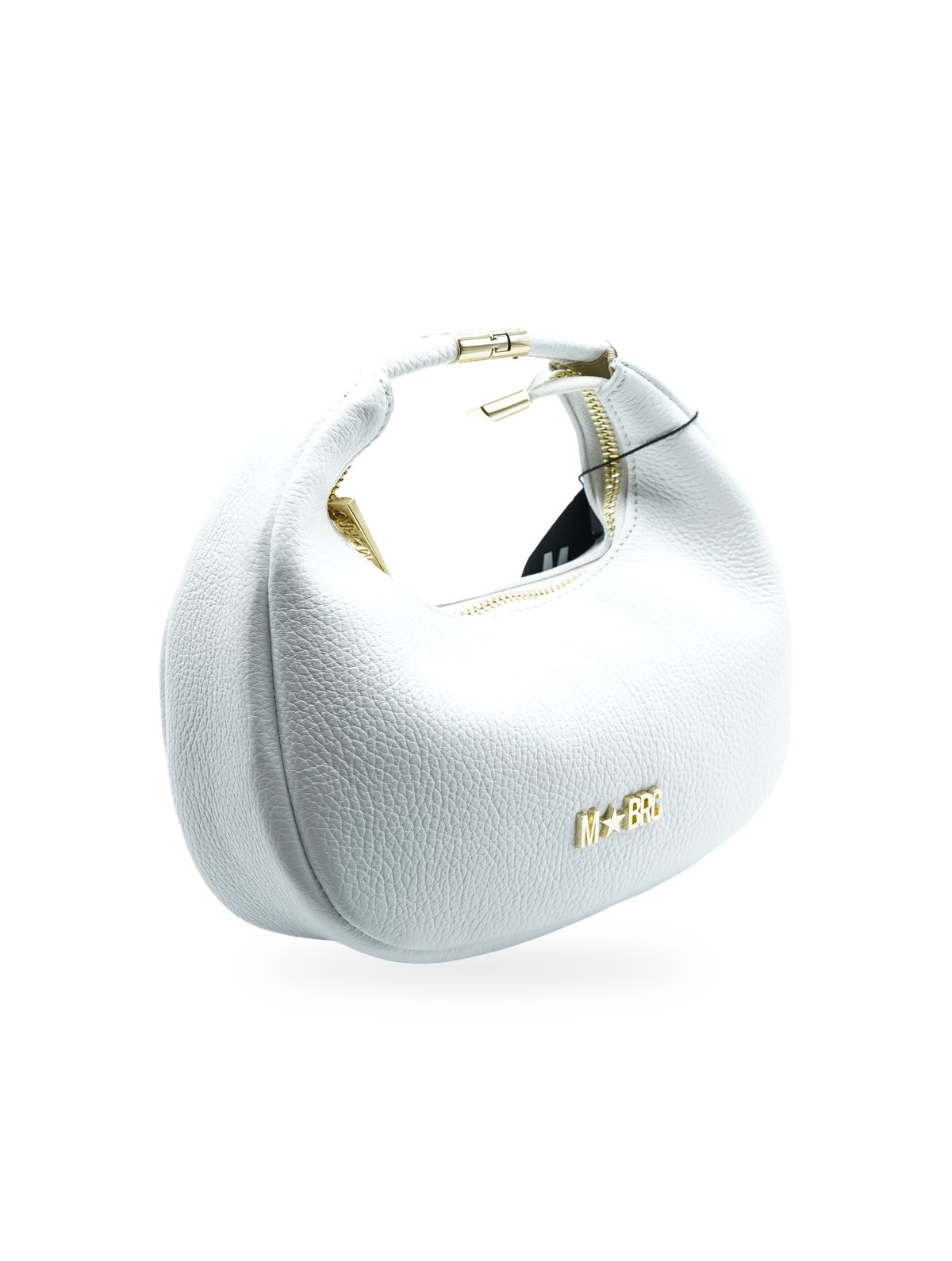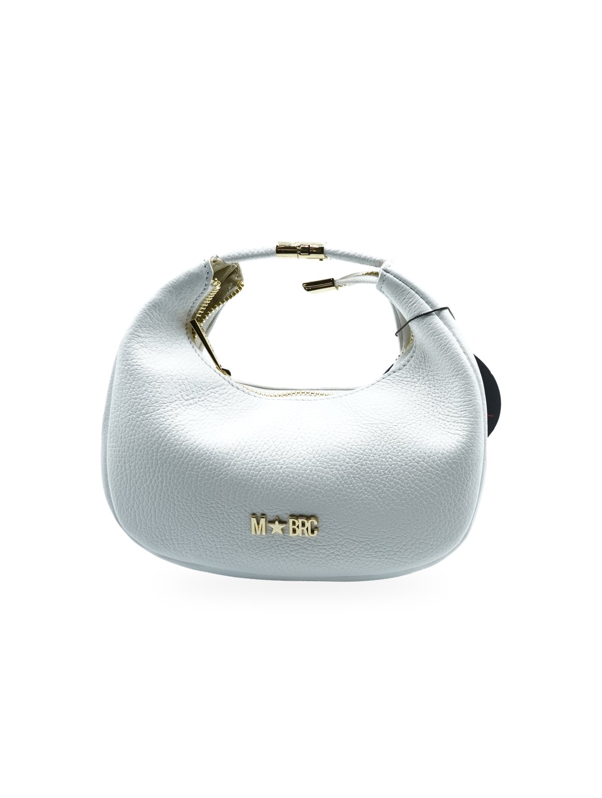Realizzata in pelle di alta qualità con finitura bianca luminosa e texture granulata, la borsa si distingue per il manico tubolare rivestito in pelle che termina con eleganti dettagli metallici dorati. La chiusura è impreziosita da una cerniera con cursore dorato che riprende l’estetica del logo MBRC posizionato frontalmente.