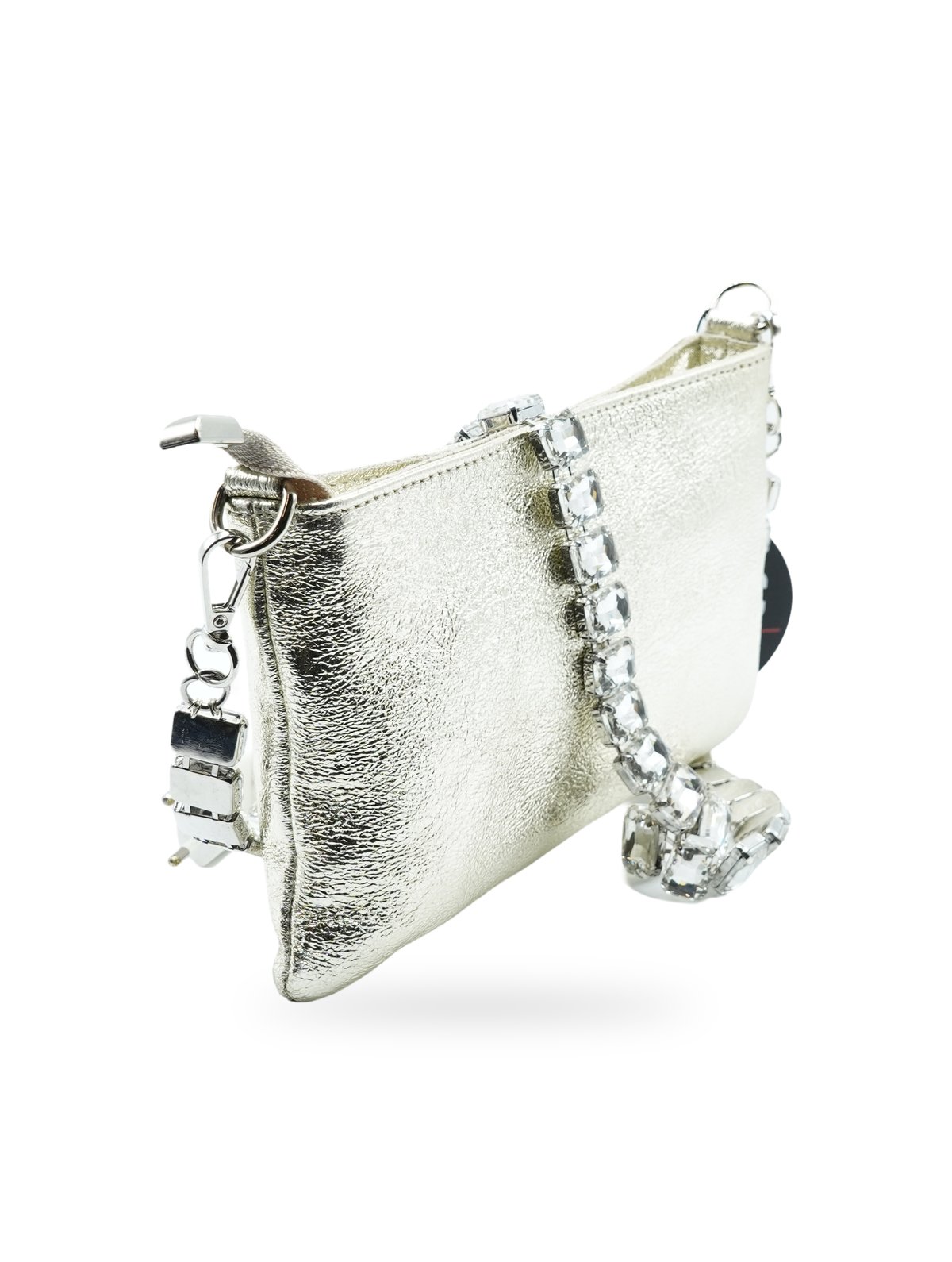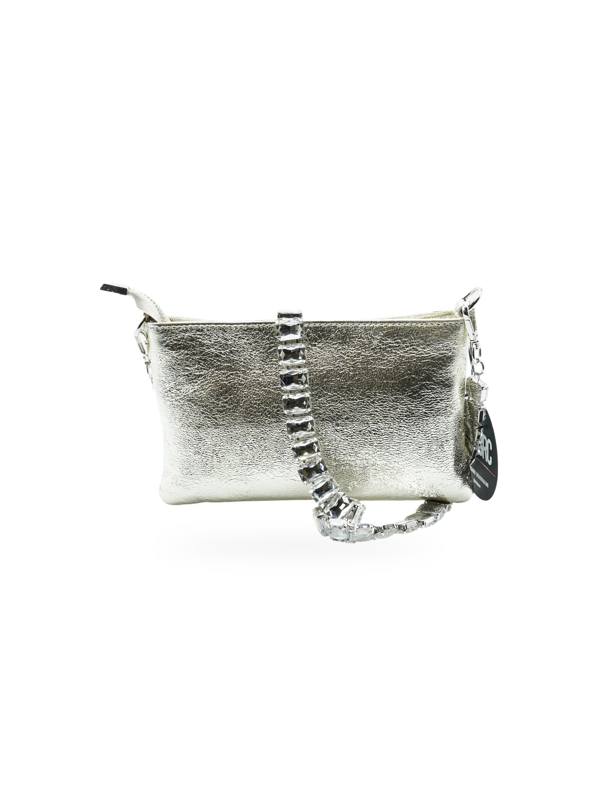 Elegante borsa a tracolla MBRC in pelle laminata platino con dettagli strass, perfetta per cerimonie ed eventi speciali.