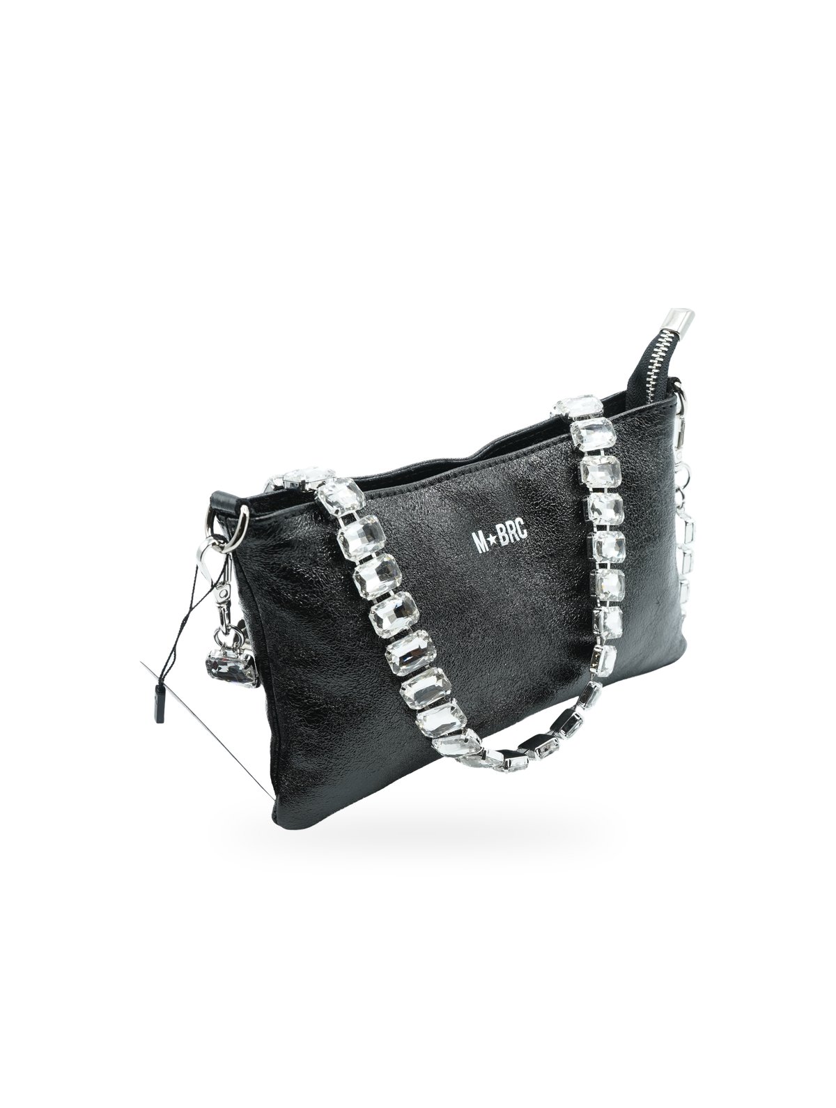 Borsa tracolla MBRC in pelle laminata nera con applicazioni strass cristallo. Design glamour con catena metallica removibile per look versatile giorno/sera.