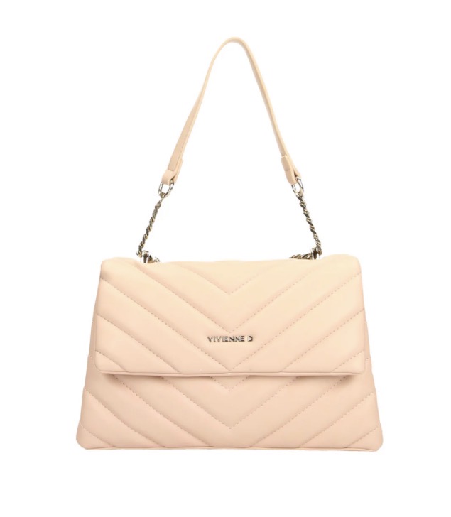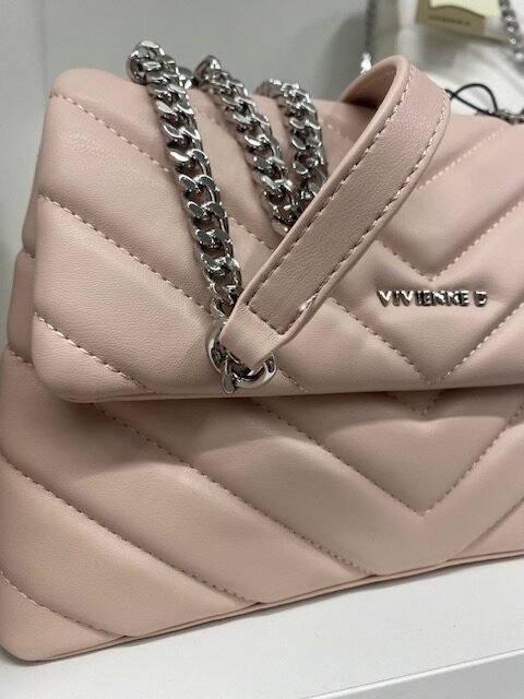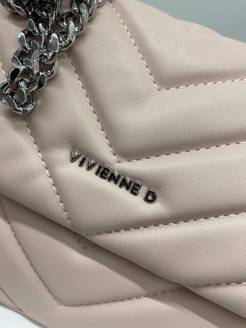 Mini bag in ecopelle colore rosa con due tasche interne di cui una con zip, logo Vivienne D in finitura argentata