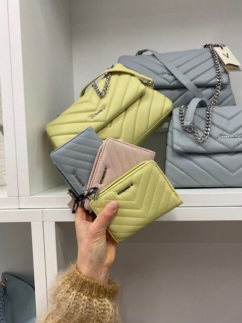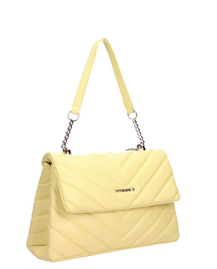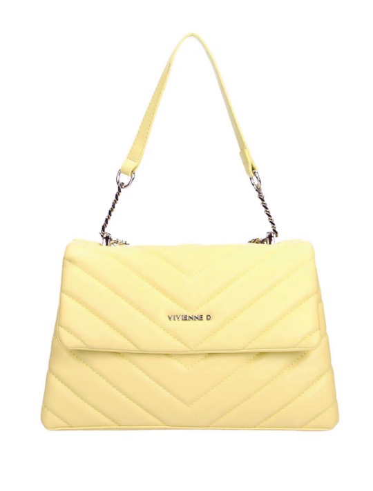 Mini bag in ecopelle colore giallo con due tasche interne di cui una con zip, logo Vivienne D in finitura argentata