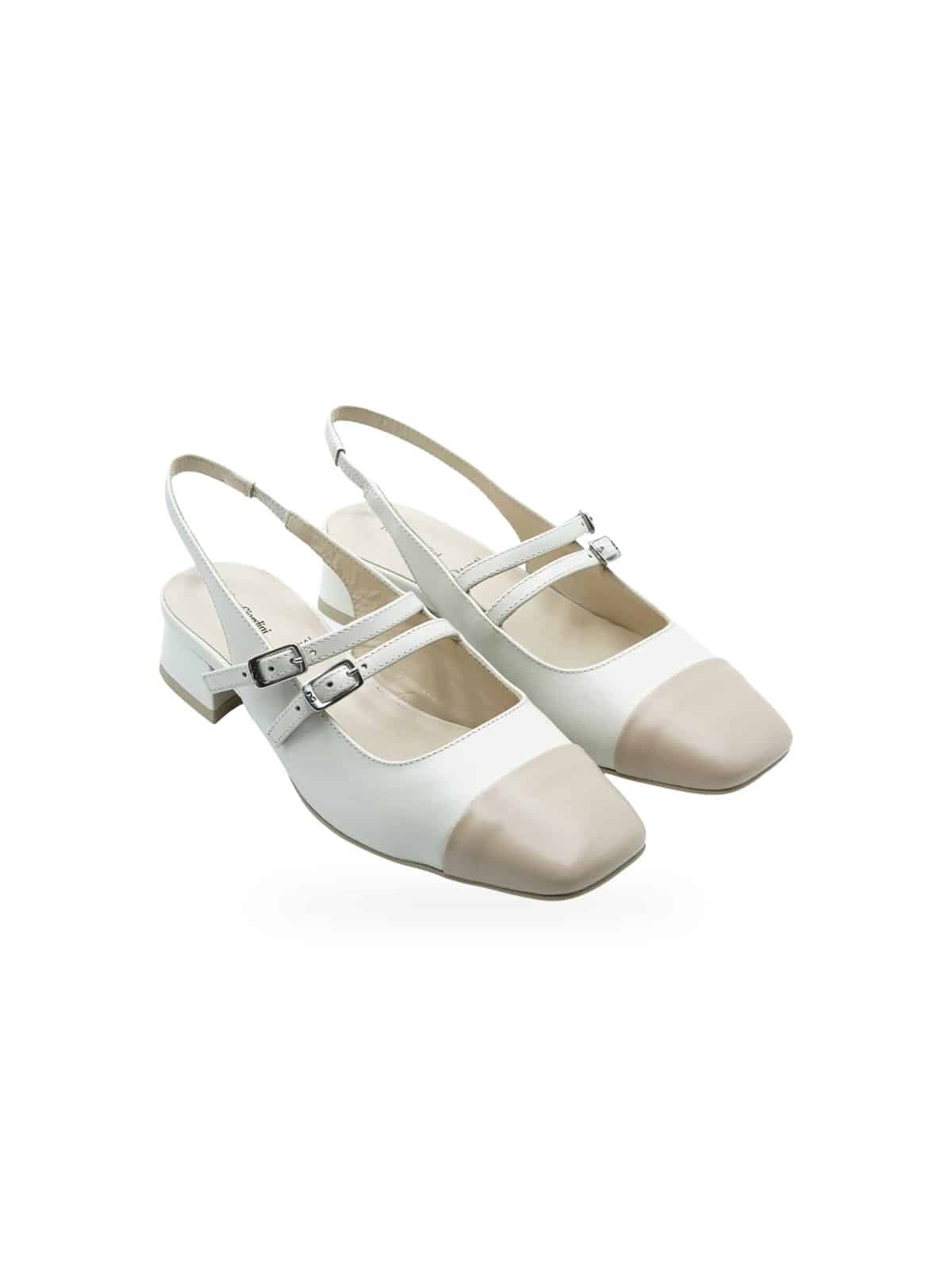 Il design bicolore è caratterizzato dalla combinazione armoniosa tra il corpo della scarpa in pelle cipria e la punta squadrata in tonalità beige nude. La doppia cinghia regolabile con fibbie in metallo argentato garantisce una vestibilità personalizzabile e sicura, mentre il cinturino posteriore slingback assicura stabilità durante la camminata.