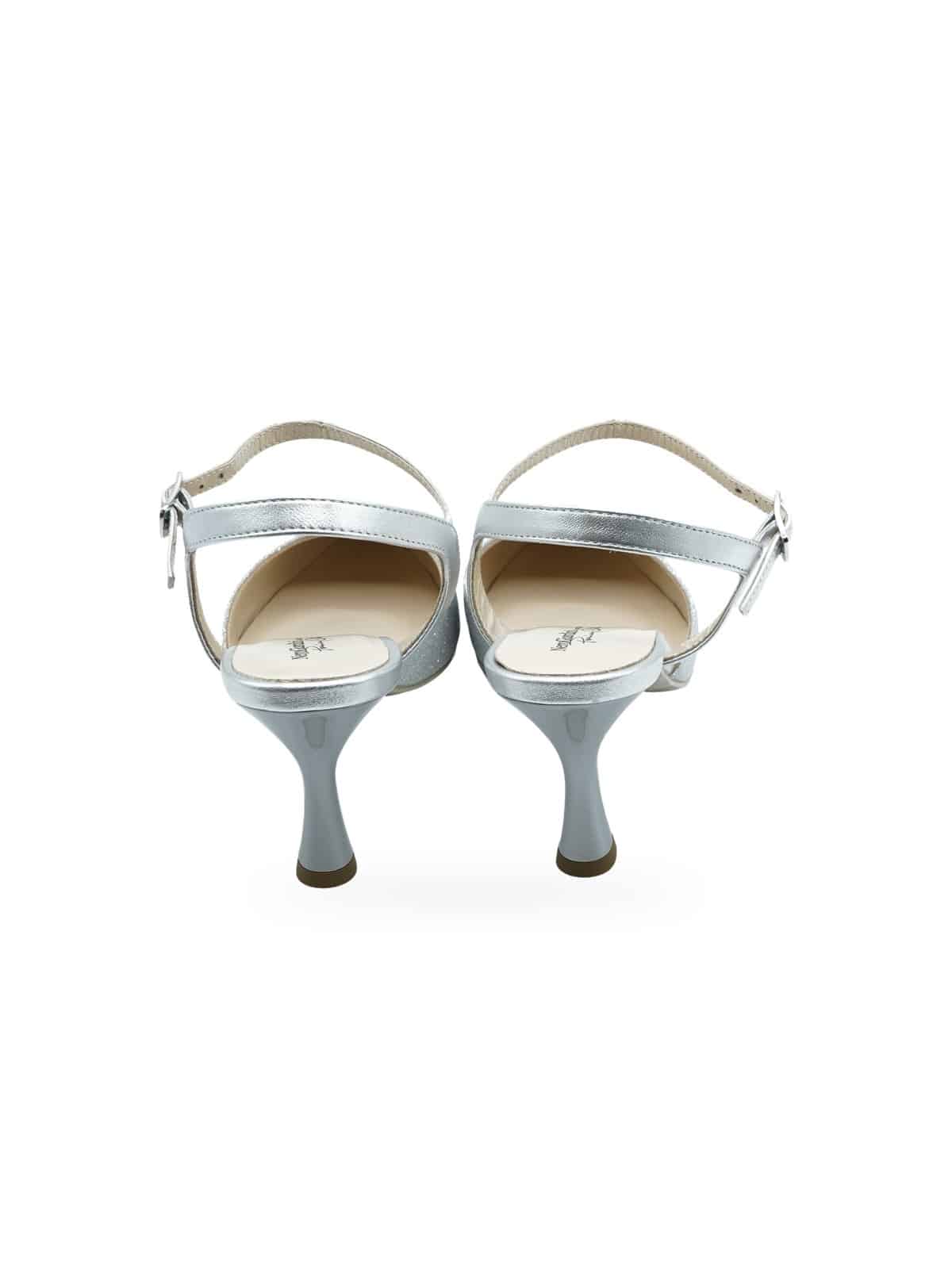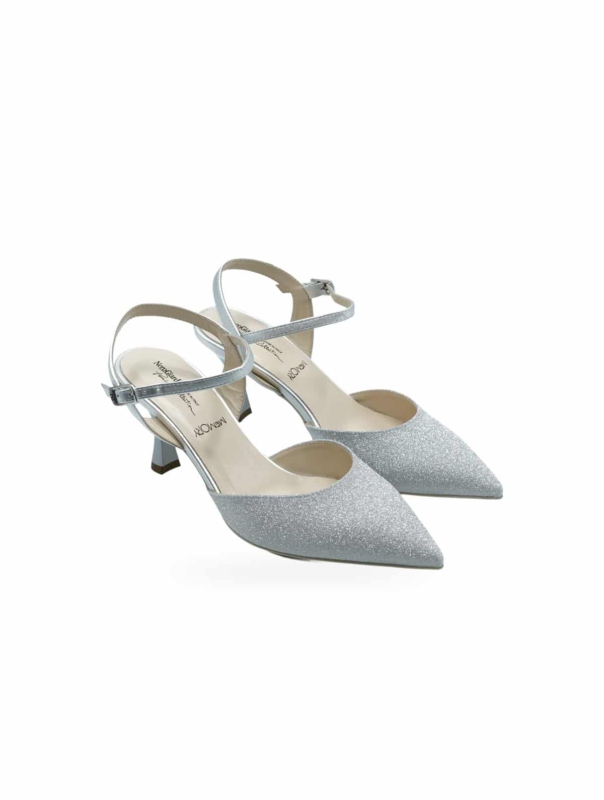 Il design presenta una punta affusolata che allunga la silhouette del piede, mentre il pratico cinturino regolabile alla caviglia con fibbia metallica garantisce una vestibilità perfetta e sicura. La tomaia in pelle glitterata è impreziosita da una texture brillante che crea riflessi cangianti, mentre la fodera interna in pelle naturale assicura comfort e traspirabilità.