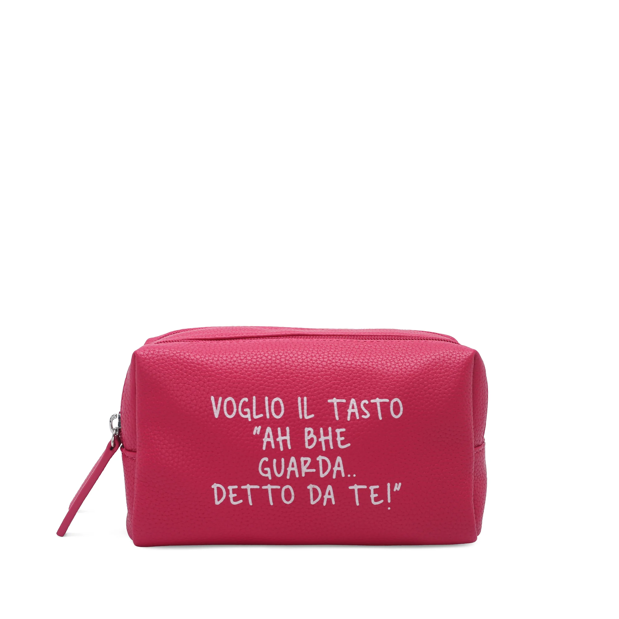 La Trousse Le Pandorine in ecopelle fucsia è l’accessorio più audace della collezione. Scritta irriverente sul fronte, doppia zip e doppio scomparto: quando hai qualcosa da dire, lo dici anche con il colore.