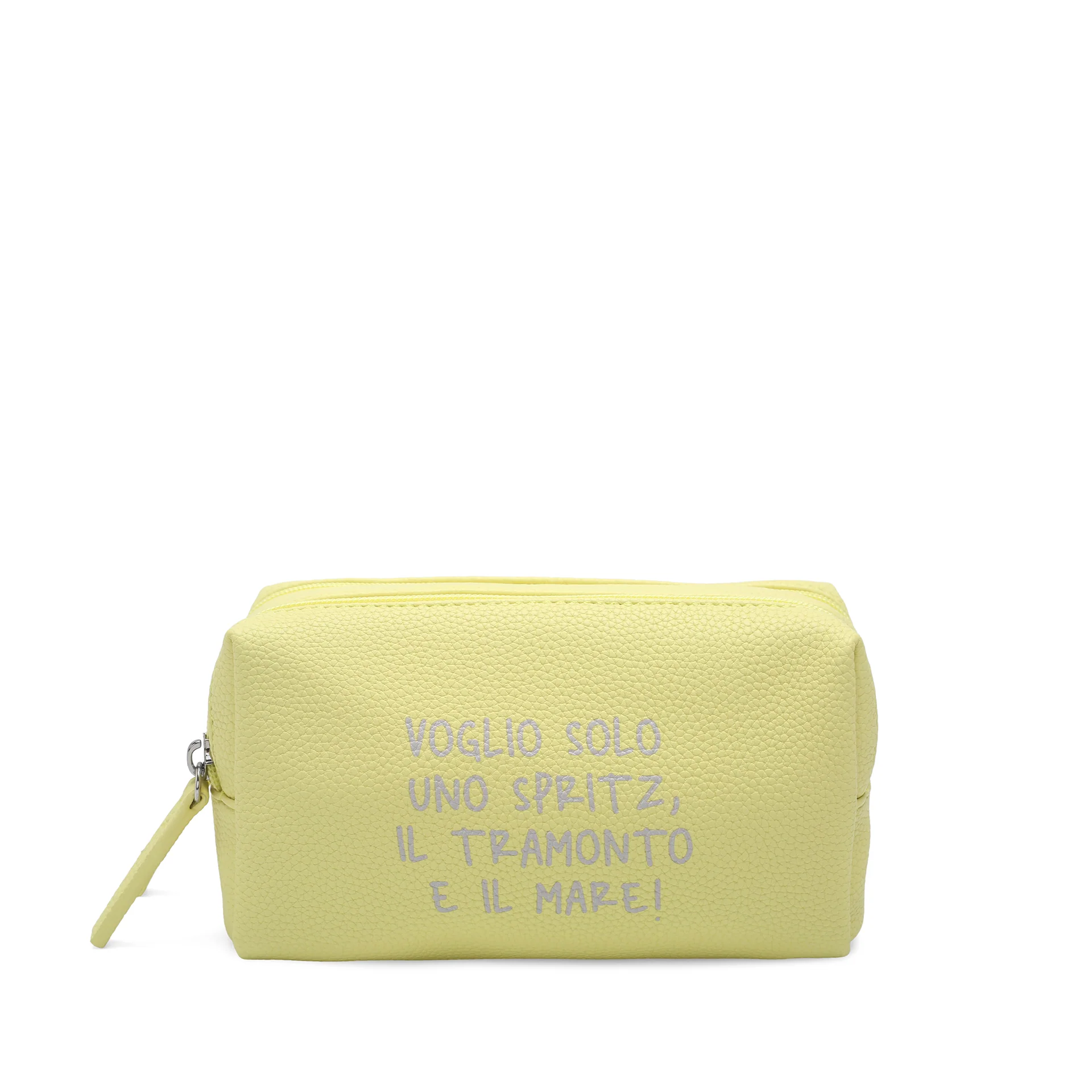 Perfetta come trousse porta trucchi, porta accessori o beauty case da viaggio. Si infila in qualsiasi borsa senza ingombro e si trova sempre subito — il giallo non si nasconde, e non ha nessuna intenzione di farlo.
